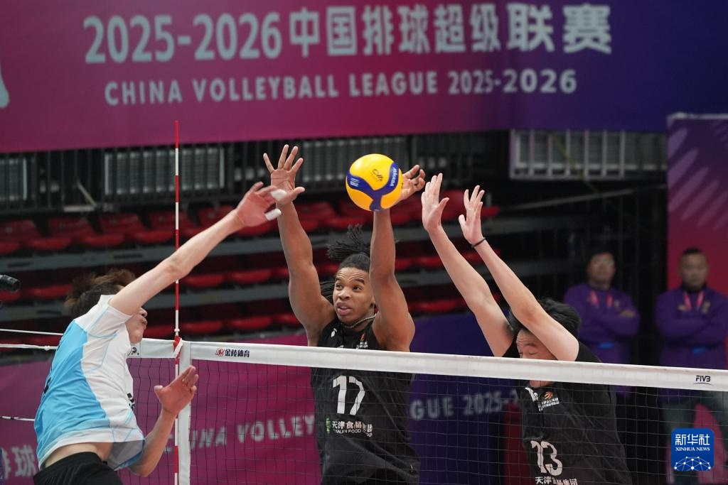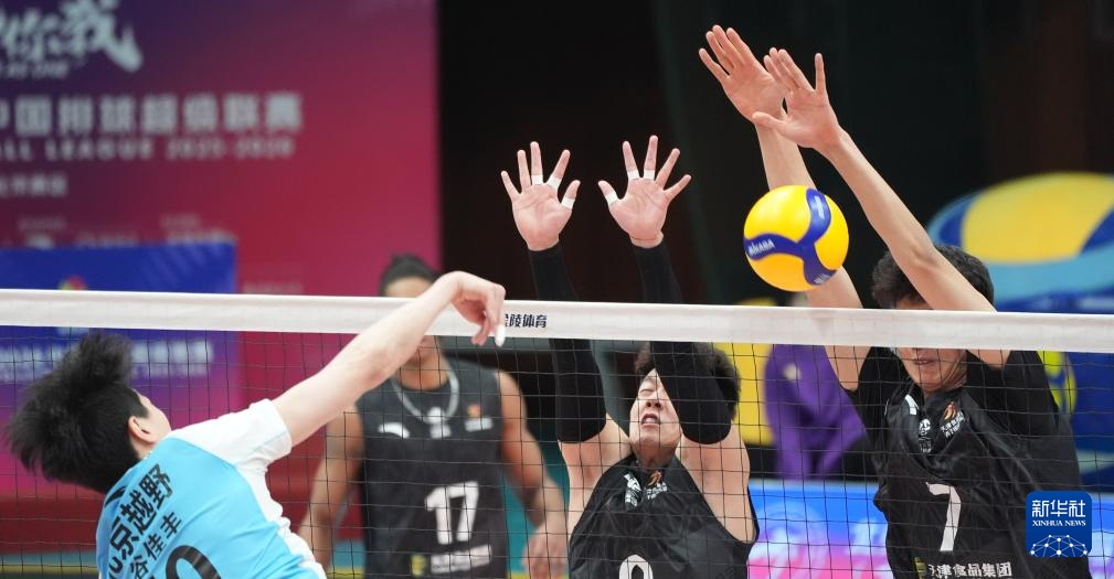 3月8日,天津食品集团队球员阿里汉德罗(中)、陈龙海(右)在比赛中拦网。新华社记者 谢晗 摄